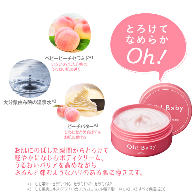 じわじわと美容成分をお肌に届けるピーチバター(保湿成分)が