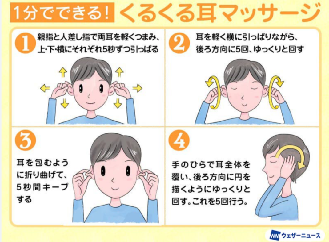 ・耳を温める:天気の変化の予兆を感じたら、耳周りを温めることで血行を促進し、症状を和らげることが期待できます。